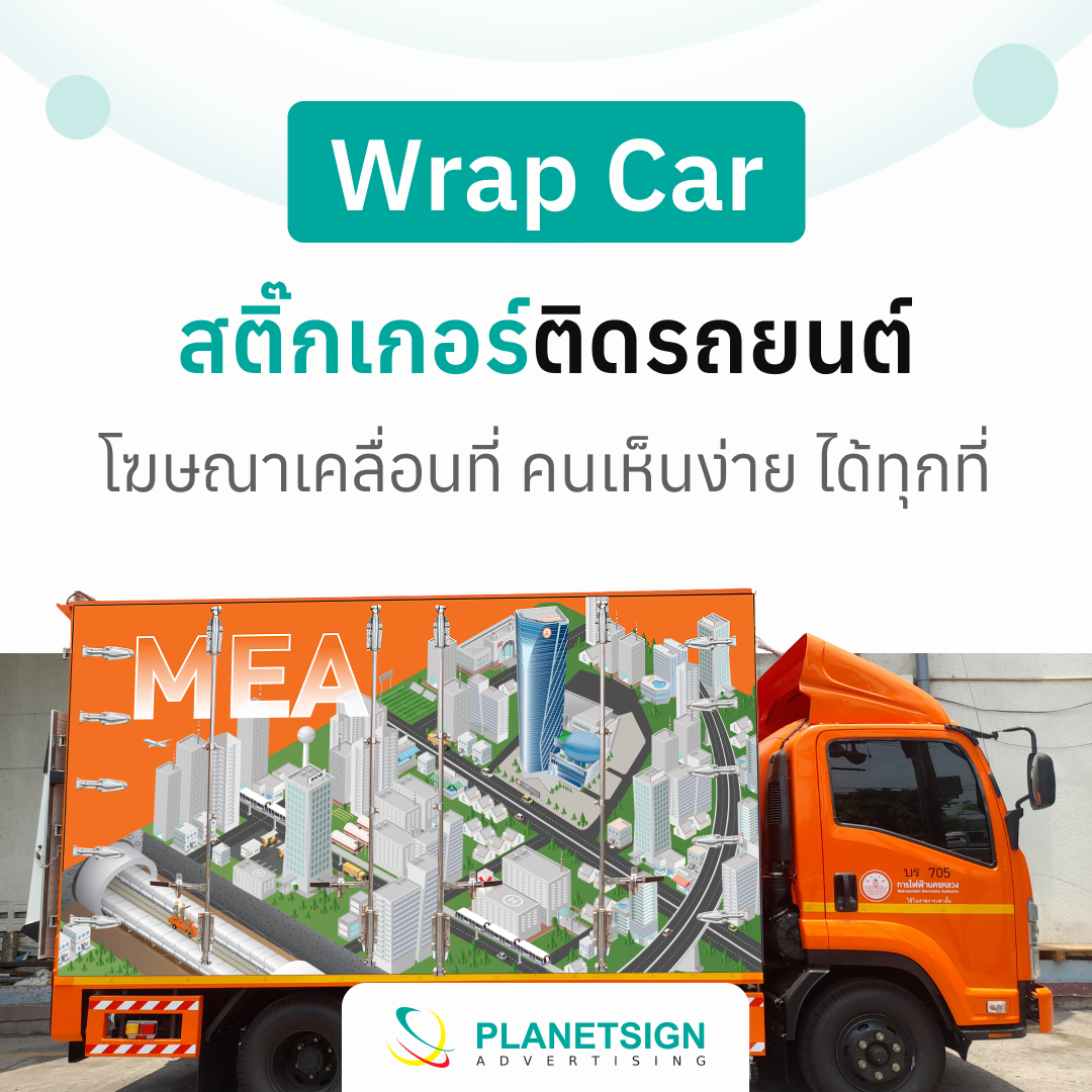 Wrap Car คือการใช้สติ๊กเกอร์ไวนิลคุณภาพสูงในการหุ้มตัวรถยนต์ทั้งหมดหรือบางส่วน เพื่อนำมาใช้เป็นสื่อโฆษณาเคลื่อนที่ รูปแบบนี้เป็นทางเลือกที่คุ้มค่าและมีประสิทธิภาพในการโปรโมตสินค้าและบริการ