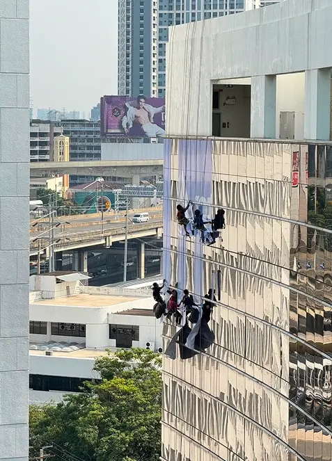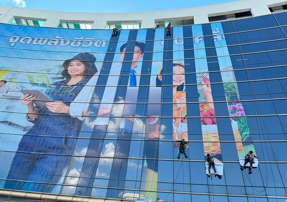 งานติดตั้งสติ๊กเกอร์บนอาคารสูงเป็นงานที่มีความซับซ้อนสูงและมีความเสี่ยง ทีมงานทุกคนผ่านการอบรมและถือใบรับรอง